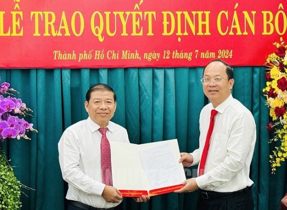 | Phó Bí thư Thường trực Thành ủy TP. Hồ Chí Minh Nguyễn Hồ Hải (bìa phải) trao quyết định cho ông Nguyễn Thanh Sang. Ảnh: Thành ủy TP. Hồ Chí Minh |
