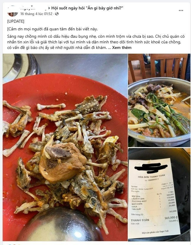 Theo thông tin chị T. chia sẻ, thấy nồi lẩu ếch bất thường, vợ chồng chị có hỏi nhân viên thì được giải thích là do nhân viên “bê nhầm”. “Sau vài lần nhân viên chạy đi chạy lại kiểm tra, thì chị nhân viên lúc đầu bê nồi ra cho bọn mình chạy ra giải thích là nồi đó là nồi lẩu Thái 1 khách khác gọi, nhân viên bỏ nhân lẩu vào rồi nhưng khách đó không ăn nữa mà đổi lẩu, nên chị ấy bê nhầm nồi này ra cho nhà mình”, chị T. viết.