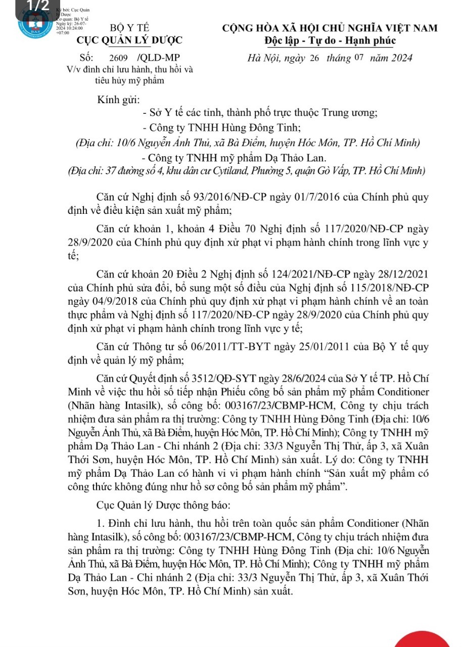 Thông báo nêu rõ, đình chỉ lưu hành, thu hồi trên toàn quốc sản phẩm Conditioner (Nhãn hàng Intasilk), số công bố: 003167/23/CBMP-HCM, Công ty chịu trách nhiệm đưa sản phẩm ra thị trường là Công ty TNHH Hùng Đông Tinh (địa chỉ: 10/6 Nguyễn Ảnh Thủ, xã Bà Điểm, huyện Hóc Môn, TP. Hồ Chí Minh). Sản phẩm này được sản xuất bởi Công ty TNHH mỹ phẩm Dạ Thảo Lan - Chi nhánh 2 (địa chỉ: 33/3 Nguyễn Thị Thử, ấp 3, xã Xuân Thới Sơn, huyện Hóc Môn, TP. Hồ Chí Minh). Lý do đình chỉ lưu hành, thu hồi do sản phẩm có công thức không đúng như hồ sơ công bố sản phẩm mỹ phẩm.
