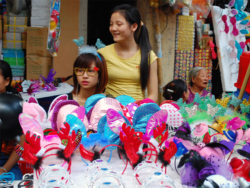 Ngoài ra, các sản phẩm handmade hóa trang được các bạn trẻ đón nhận nhiệt tình cũng được quan tâm. Cũng như mấy năm trước, không thể thiếu đồ chơi mặt nạ, bờm cài tóc, mũ, kính. Mỗi chiếc nơ cài đầu có đèn nhấp nháy giá giao động từ 45 - 70 ngàn đồng/chiếc, mũ nơ bằng chất liệu lấp lánh, bắt sáng với giá 25 - 105 ngàn đồng/chiếc tùy loại, kính mắt nhựa giá từ 15 - 50 ngàn đồng/đôi.