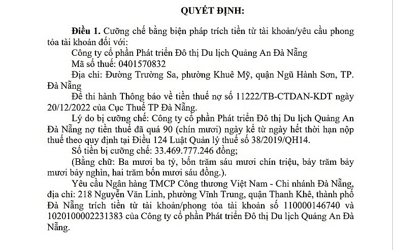 Theo đó, quyết định trên được ông Phạm Đức Thường, Cục trưởng Cục Thuế TP Đà Nẵng ký ban hành. Theo quyết định này, cơ quan thuế sẽ cưỡng chế bằng biện pháp trích tiền từ tài khoản/yêu cầu phong tỏa tài khoản đối với Đô thị Du lịch Quảng An Đà Nẵng.