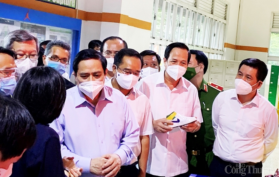 Đến thăm, kiểm tra công tác phòng chống dịch tại Công ty TNHH Giầy Ching Luh Việt Nam (KCN Thuận Đạo, huyện Bến Lức), đại diện doanh nghiệp đã báo cáo với Thủ tướng Phạm Minh Chính về tình hình sản xuất kinh doanh và công tác phòng dịch của xưởng sản xuất.