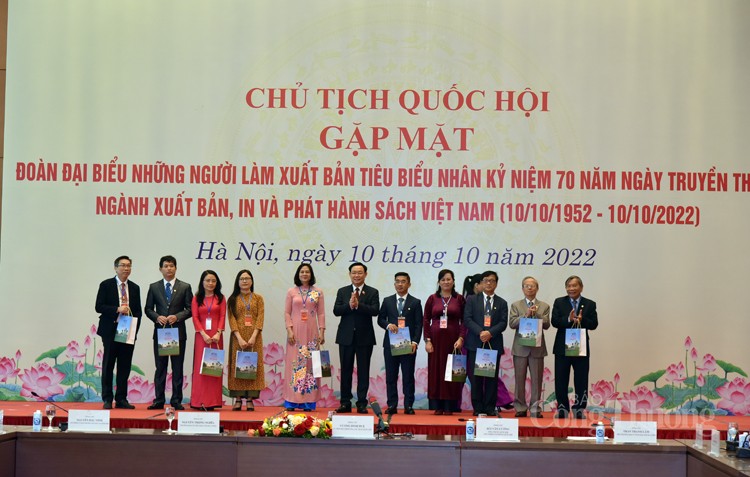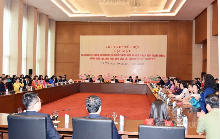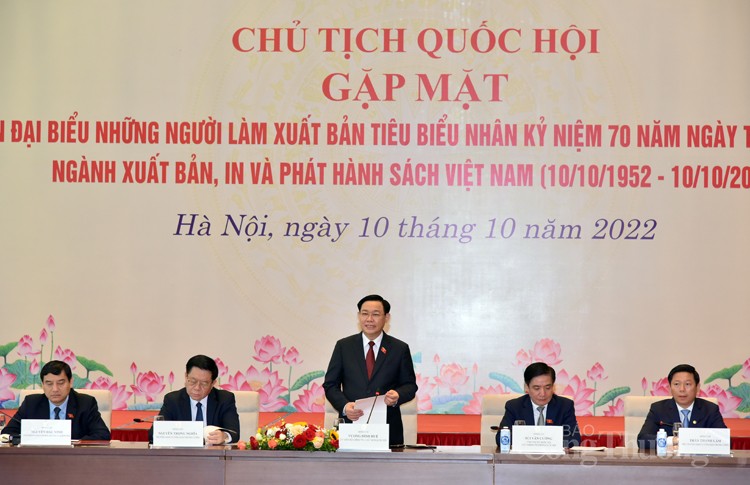 Phát biểu tại tại buổi gặp mặt đoàn đại biểu những người làm Xuất bản tiêu biểu, Chủ tịch Quốc hội Vương Đình Huệ bày tỏ rất vui mừng được gặp mặt 86 đại biểu người làm Xuất bản tiêu biểu - đại diện cho 57 nhà Xuất bản và hàng ngàn cơ sở In, cơ sở Phát hành trên cả nước về Thủ đô Hà Nội để dự Kỷ niệm 70 năm Ngày truyền thống ngành Xuất bản, In và Phát hành sách Việt Nam (10/10/1952 - 10/10/2022). Thay mặt lãnh đạo Đảng, Nhà nước, Quốc hội, Ủy ban Thường vụ Quốc hội, Chủ tịch Quốc hội gửi tới các đại biểu, đội ngũ những người làm công tác trong lĩnh vực Xuất bản, In và Phát hành cả nước những tình cảm thân thiết và lời chúc mừng tốt đẹp nhất.