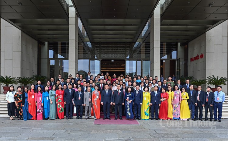 | Chủ tịch Quốc hội Vương Đình Huệ, Trưởng ban Tuyên giáo Trung ương Nguyễn Trọng Nghĩa chụp ảnh lưu niệm với các đại biểu tại buổi gặp mặt. |