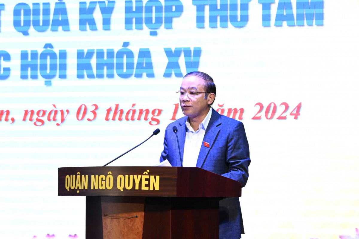 Tại hội nghị, đồng chí Nguyễn Quốc Thái - Phó Chủ tịch Thường trực UBND quận Ngô Quyền, TP. Hải Phòng cũng cho biết, cử tri quận Ngô Quyền cùng cử tri thành phố Hải Phòng và cử tri cả nước vô cùng vui mừng phấn khởi trước những thành công tốt đẹp của kỳ họp thứ 8 Quốc hội khóa XV. Qua theo dõi báo cáo của Thủ tướng Chính phủ tại kỳ họp, cử tri rất phấn khởi trước những thành tựu về kinh tế - xã hội của đất nước, TP. Hải Phòng đạt được trong năm 2024; đánh giá cao công tác điều hành của Chính phủ trong chỉ đạo tổ chức thực hiện các nhiệm vụ, nhất là nhiệm vụ trọng tâm (trong 11 tháng đã tổ chức 10 phiên họp chuyên đề về pháp luật, trình Quốc hội thông qua 50 Luật, nghị quyết…); hoàn thành nhiều công trình quốc gia trọng điểm theo phương châm không ngừng nghỉ ví dụ như hoàn thành dự án đường dây 500 kV mạch 3 Quảng Bình - Hưng Yên trong vòng 6 tháng, một số đoạn đường cao tốc nâng tổng số chiều dài lên 2.021 km, đầu tư hạ tầng số, hạ tầng viễn thông, đưa vào khai thác 109 km đoạn Cam Lâm - Diễn Hảo, Vĩnh Châu - QL46B...