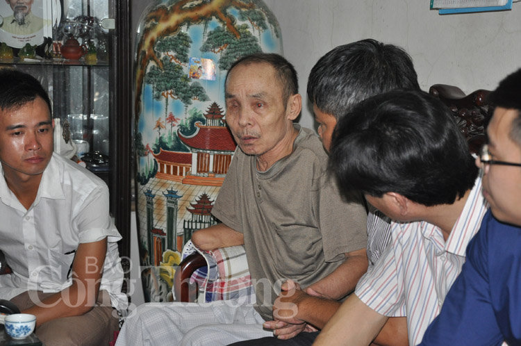 Đoàn tới động viên và thăm hỏi thương bình Đàm Hồng Hạng (áo xám) |