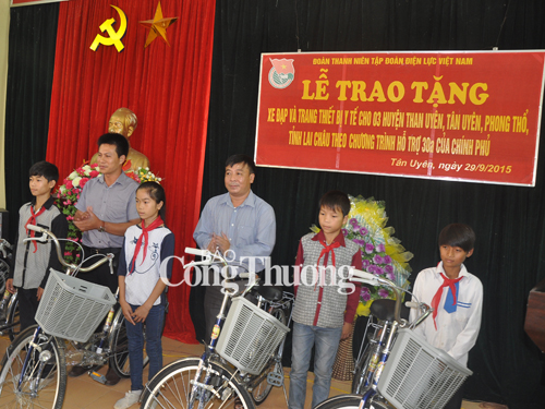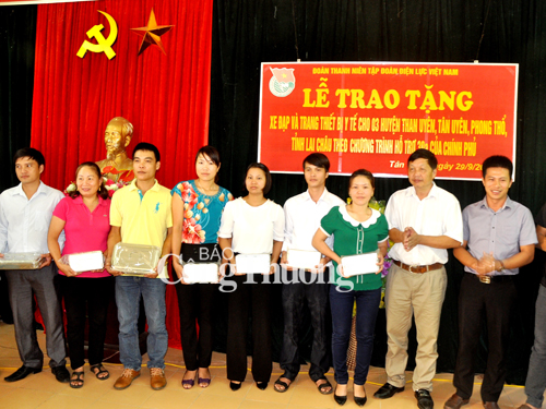 Theo đó, Đoàn Thanh niên EVN đã trao tặng 100 chiếc xe đạp cho học sinh nghèo vượt khó tại 03 huyện (35 học sinh tại huyện Tân Uyên, 35 học sinh huyện Than Uyên, 30 học sinh huyện Phong Thổ) và 30 bộ trang thiết bị y tế gồm: giường bệnh, bộ tiểu phẫu, tủ đựng thuốc, bộ khám ngũ quan, đèn treo trán, đèn gù, bộ cố định gẫy xương và bộ đỡ đẻ cho 30 trạm y tế xã của 03 huyện, mỗi huyện 10 trạm với tổng giá trị quà tặng hơn 500 triệu đồng.