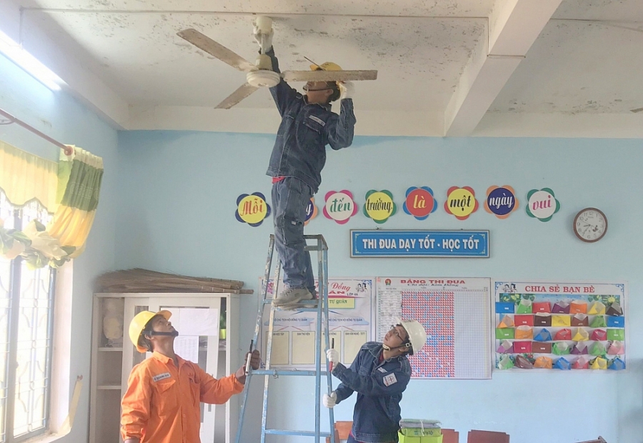 Đoàn viên EVNHCMC và EVNCPC phối hợp sửa hệ thống điện cho trường THCS Hành Thiện, huyện Nghĩa Hành, tỉnh Quảng Ngãi