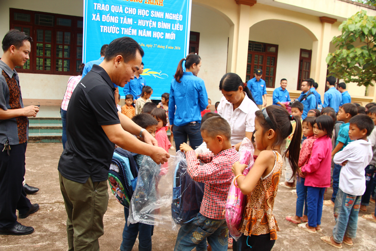 Tại xã Đồng Tâm, huyện Bình Liêu, đoàn công tác đã tới thăm các em học sinh Trường tiểu học Ngàn Phe và Trường tiểu học Ngàn Vàng Trên, tặng 78 xuất quà gồm: Cặp, sách vở cùng một số đồ dùng học tập cho các em học sinh có hoàn cảnh gia đình khó khăn, 16 bộ bàn nghế học tập với tổng kinh phí trên 39 triệu đồng, góp phần chia sẻ động viên các em học sinh có hoàn cảnh khó khăn vươn lên trong học tập.
