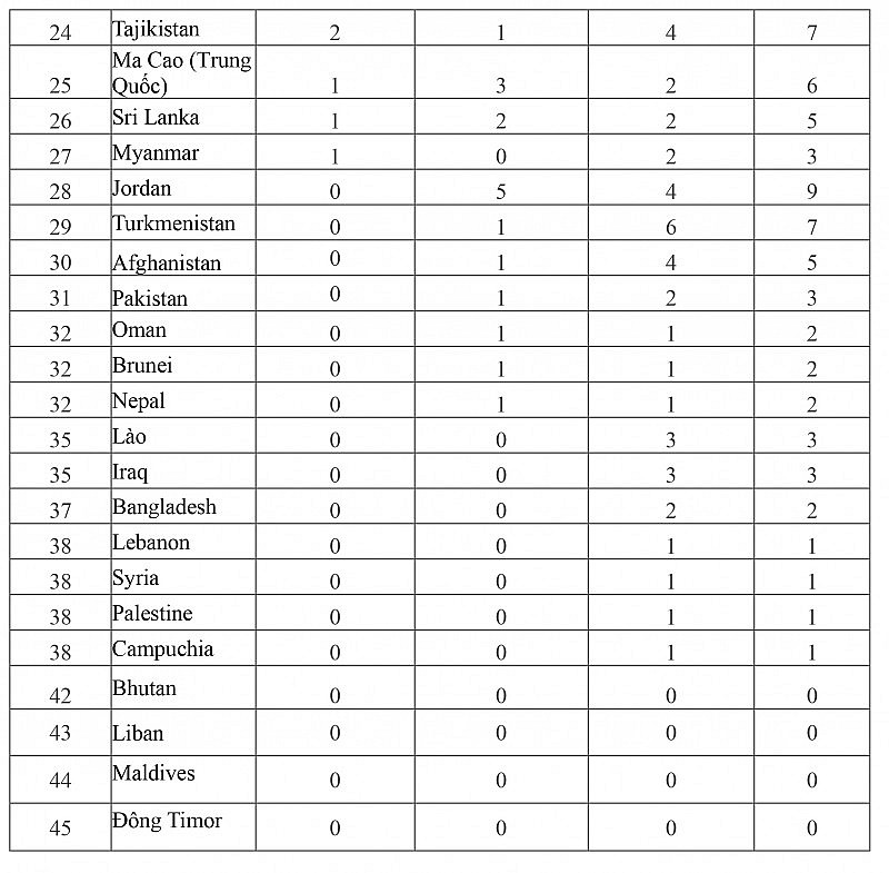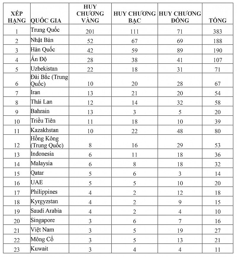 BẢNG TỔNG SẮP HUY CHƯƠNG ASIAD 19 – NGÀY 8/10: