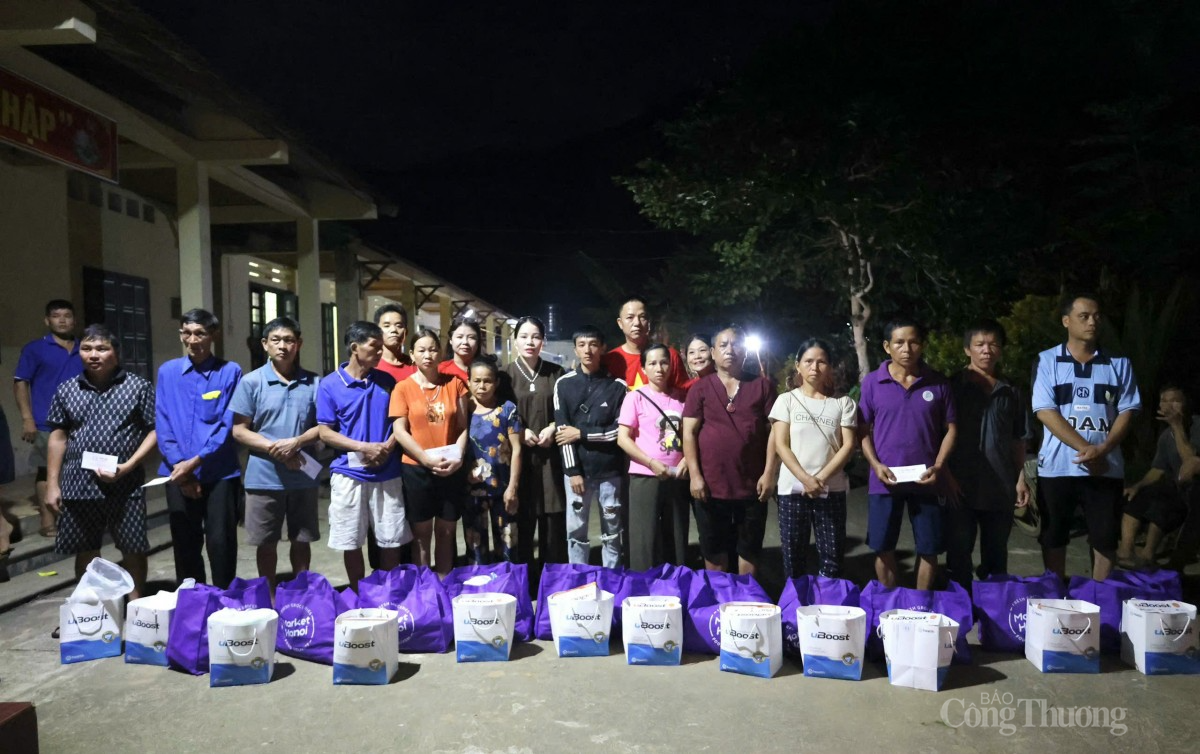| Đại diện Đoàn công tác Báo Công Thương trao quà cho các gia đình bị lũ cuốn trôi nhà và các hộ phải di cư do nhà có nguy cơ bị ảnh hưởng do bão. Hiện tại điểm trường học của xã có khoảng 40 hộ gia đình với hơn 100 người sinh sống, cuộc sống của những người dân nơi đây vẫn gặp rất nhiều khó khăn. Ảnh: Đỗ Nga |