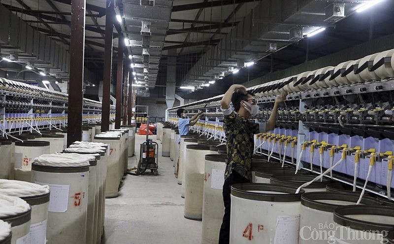 | Công nhân Nhà máy dệt may Hoàng Thị Loan tranh thủ thời điểm dây chuyền nghỉ để bảo dưỡng thiết bị dây chuyền. |
