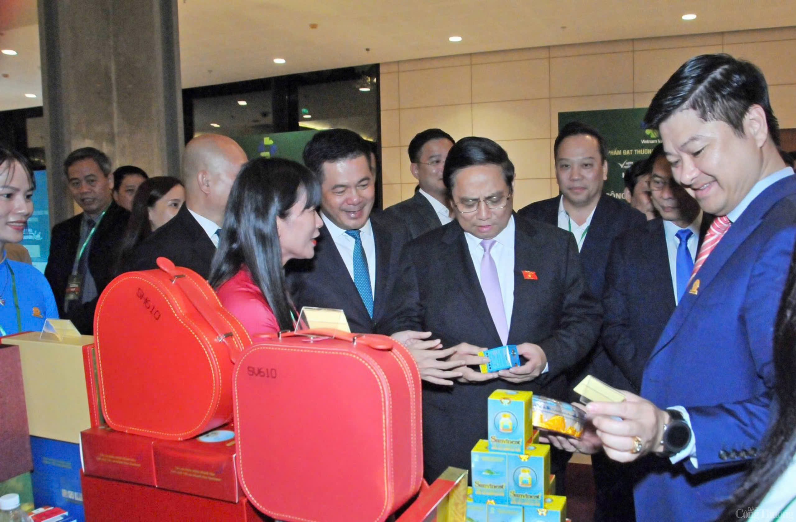 | Thủ tướng Phạm Minh Chính cùng Bộ trưởng Bộ Công Thương Nguyễn Hồng Diên tham quan gian hàng của Công ty TNHH Nhà nước MTV Yến sào Khánh Hòa. Ảnh: Phương Cúc |
