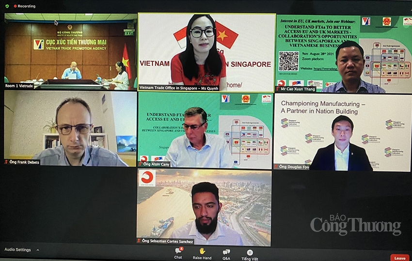 Với sáng kiến của Thương vụ Việt Nam tại Singapore cùng sự tham gia đồng tổ chức của Cục Xúc tiến thương mại (Bộ Công Thương), Vụ Chính sách Thương mại đa biên (Bộ Công Thương), phối hợp hỗ trợ của Đại sứ quán Việt Nam tại Singapore và sự ủng hộ của các cơ quan tổ chức tại Singapore và Việt Nam như: Liên đoàn sản xuất Singapore, Phòng Thương mại và công nghiệp Singapore, Trung tâm Thương mại châu Á, Eurocham Việt Nam, PwC Singapore, Hội nghị trực tuyến Tìm hiểu các hiệp định thương mại tự do (FTA) để thâm nhập hiệu quả thị trường EU và Vương quốc Anh (Anh)- Cơ hội để doanh nghiệp (DN) Việt Nam và Singapore hợp tác đã được tổ chức ngày 28/8.