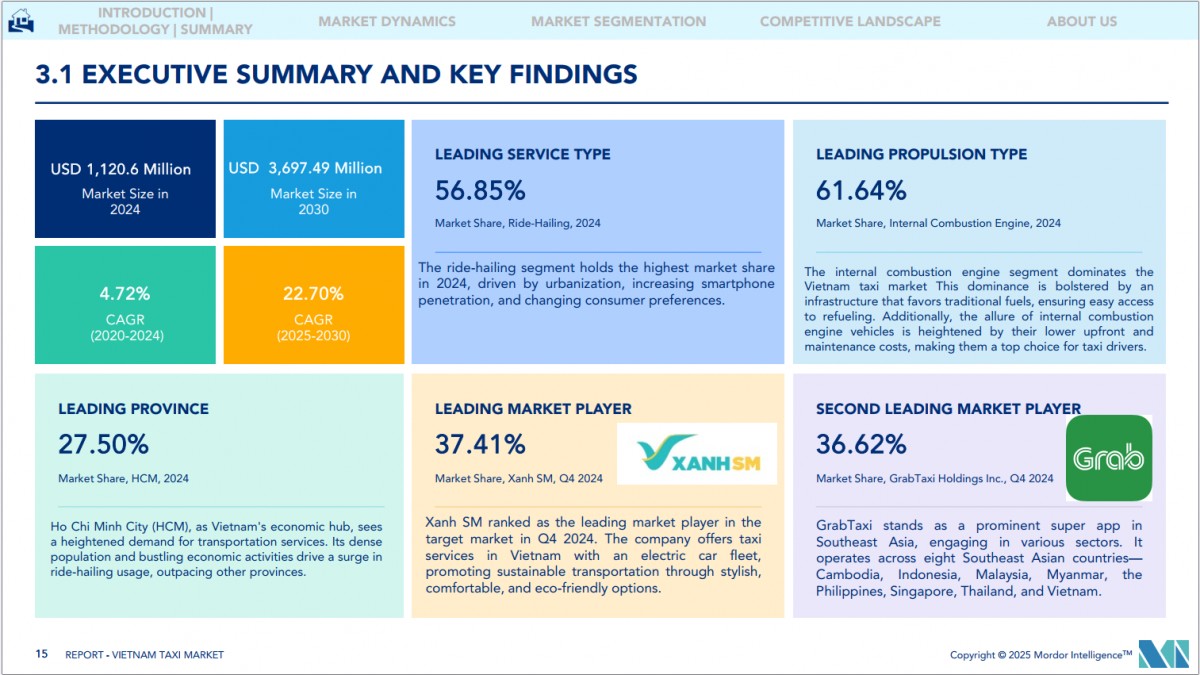 Báo cáo của Mordor Intelligence chỉ ra, trong quý 4/2024, Xanh SM chiếm số 1 thị trường với 37,41% thị phần, vượt qua Grab (36,62%) và bỏ xa các đối thủ khác như Be (5,55%), Mai Linh (4,81%), Vinasun (2,44%).