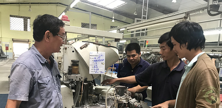 | Ông Tôn Thạnh Nghĩa (trái ảnh) luôn sát cánh với công nhân trong từng công đoạn sản xuất |
