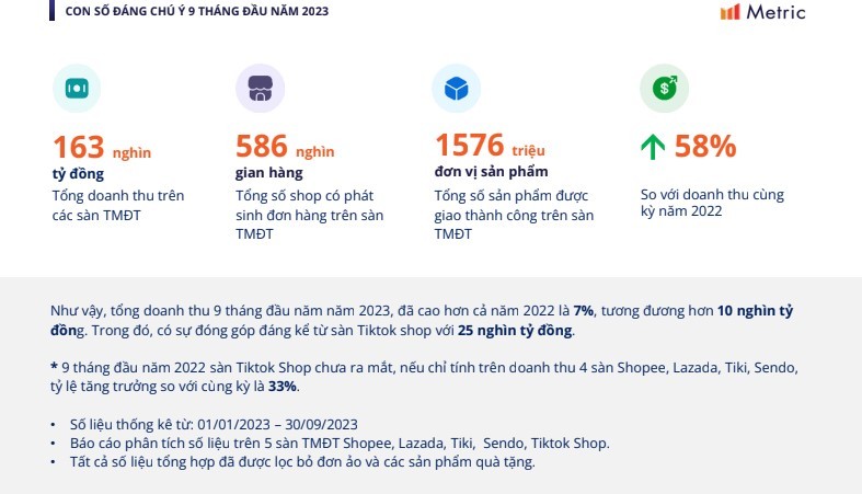 Báo cáo của Metric cho thấy, 9 tháng đầu năm 2023, tổng doanh thu trên các sàn thương mại điện tử đạt 163.000 tỉ đồng, tăng 58% so với cùng kỳ năm 2022. Tổng doanh thu 9 tháng đầu năm 2023 cao hơn năm 2022 là 7%, tương đương hơn 10.000 tỉ đồng.