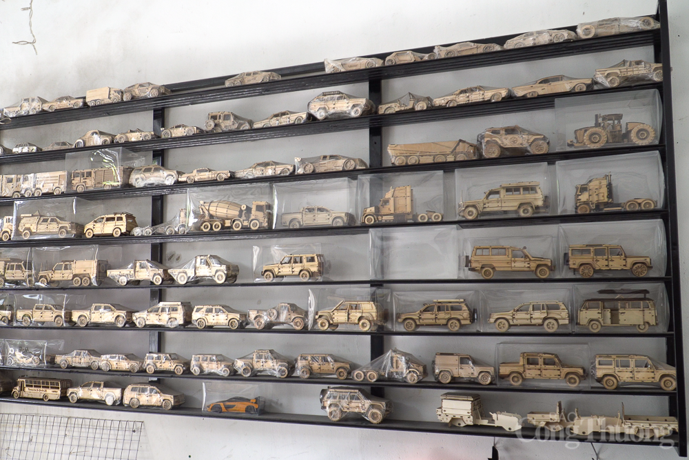 | Một góc trưng bày những mô hình ô tô từ ván gỗ của anh Tâm. |