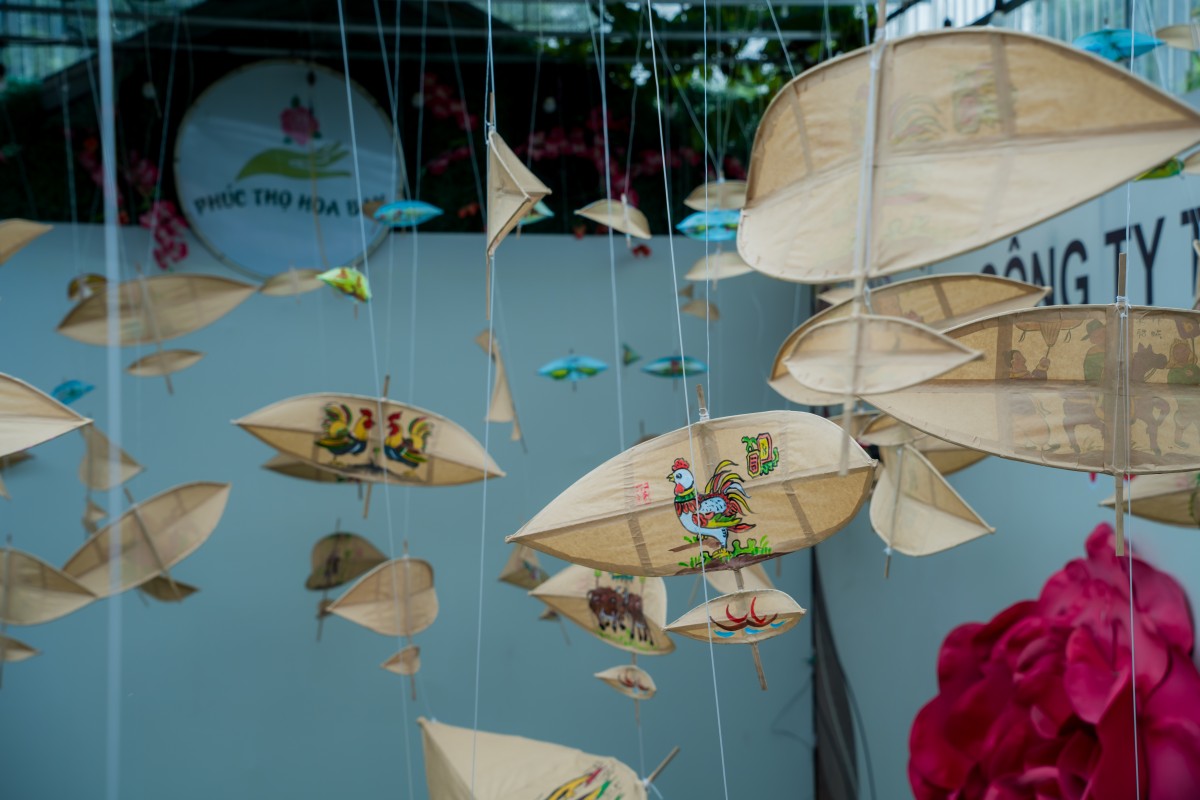 | Từng cánh diều được treo thả giữa không gian xanh mát, hòa cùng ánh sáng tự nhiên. |