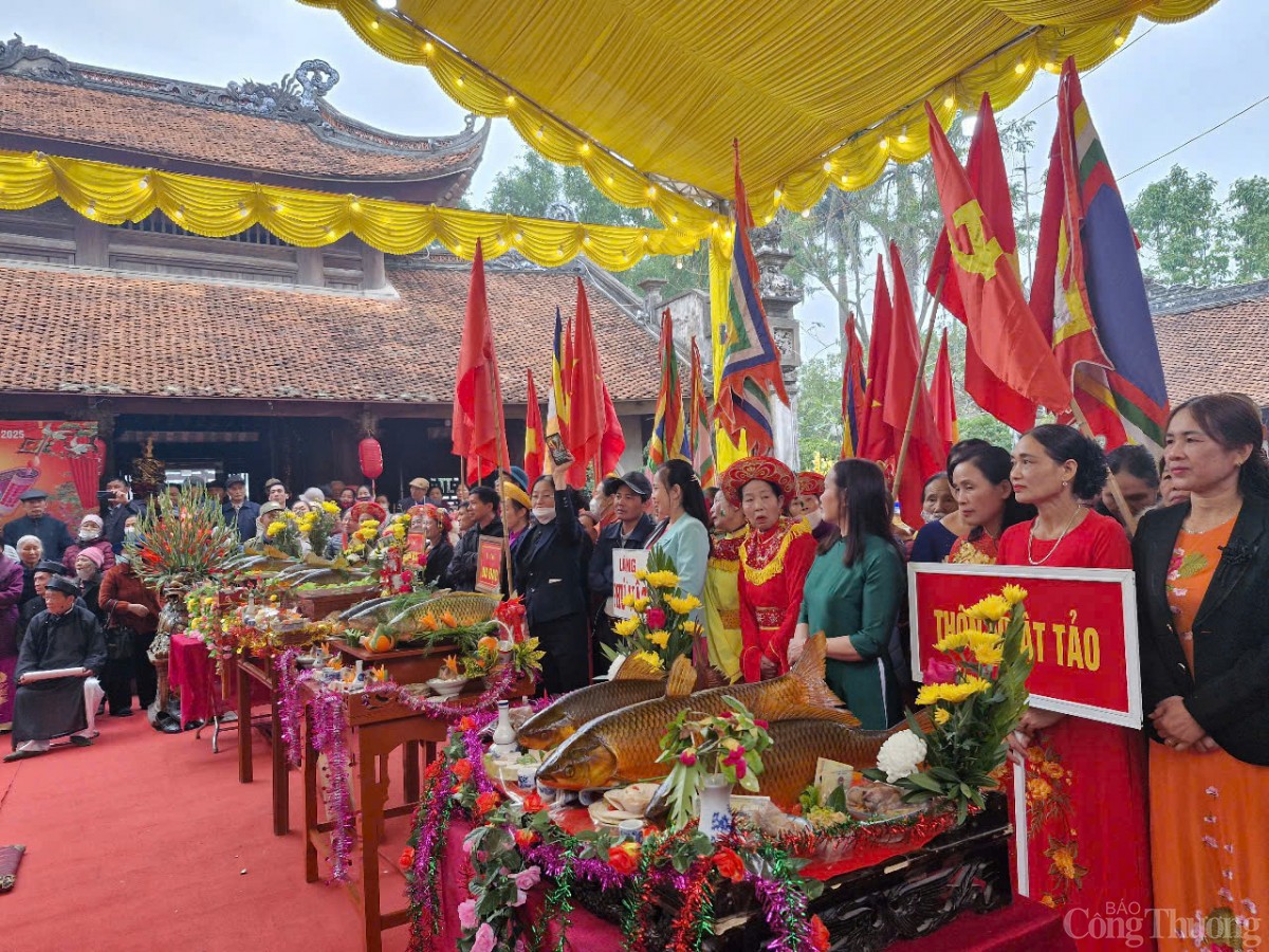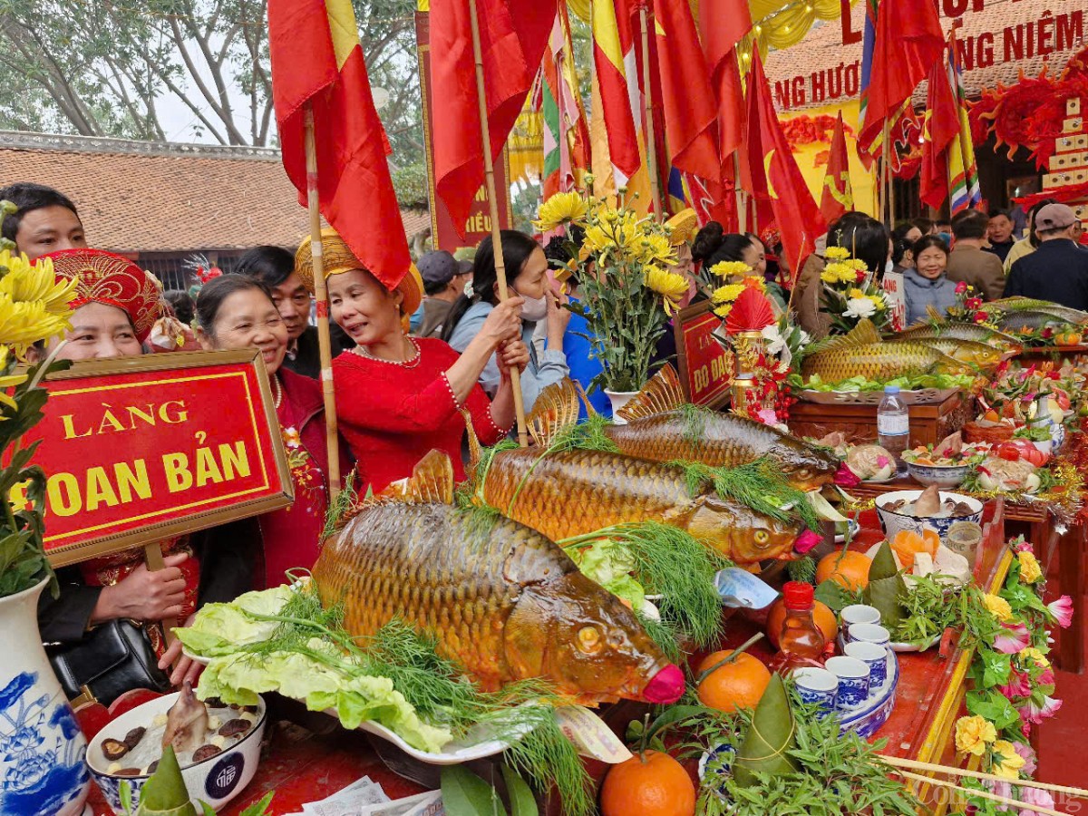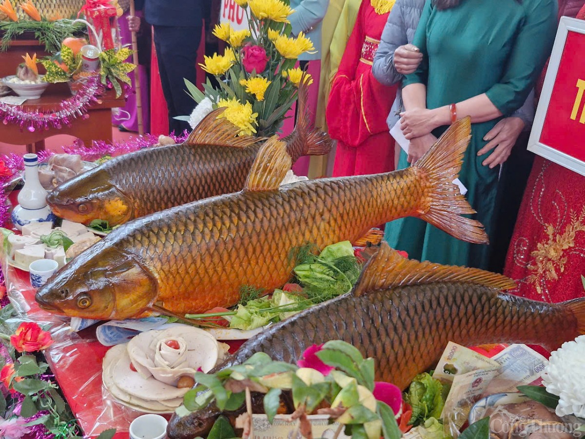 | Theo các cụ cao niên kể lại, cỗ cá có 2 loại: Cỗ cá đơn và cỗ cá kép, được bày trang trọng trên giá, mỗi giá có 8 vổ, mỗi vổ gồm có cá chép, cá mè, cá trắm, giò, chả, nem, mọc…. Ảnh Nguyễn Thuần |