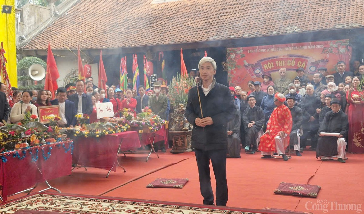 | Ông Đinh Bá Khải - Huyện ủy viên, Phó Chủ tịch UBND huyện Hưng Hà đã tới dâng hương các vị vua Trần tại trong hội thi cỗ cá. Ảnh Nguyễn Thuần |