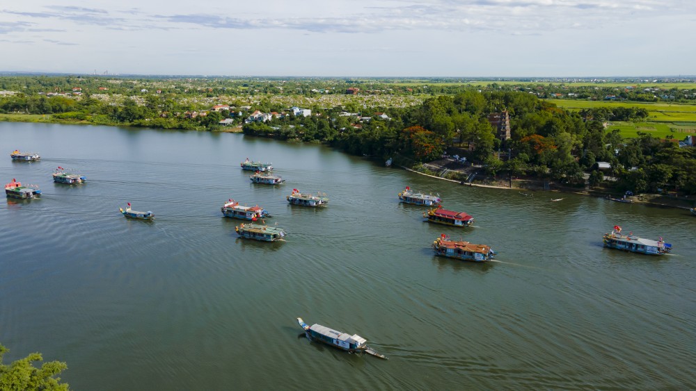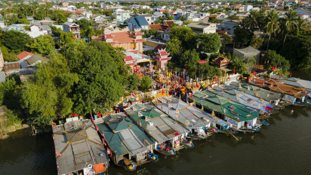 | Sau khi tiến hành lễ cáo, đoàn rước với hơn 70 bằng và châu án cung nghinh Thánh Mẫu và Hội đồng Tứ phủ xuôi theo dòng sông Hương, lên thượng nguồn đến Điện Huệ Nam. |