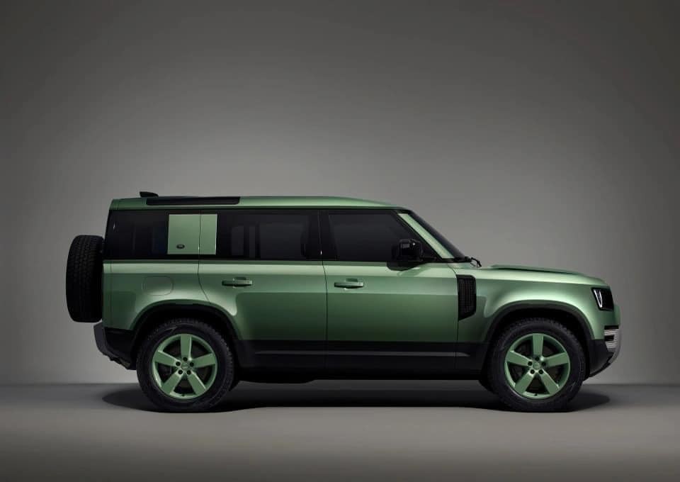 Họa tiết hình chữ H đặc trưng cũng xuất hiện ở cản trước cùng màu thân xe. Hai bên thân xe nổi bật với vòm bánh xe cỡ lớn, góc cạnh, trái ngược với vòm bánh xe được bo tròn hơn của Defender.