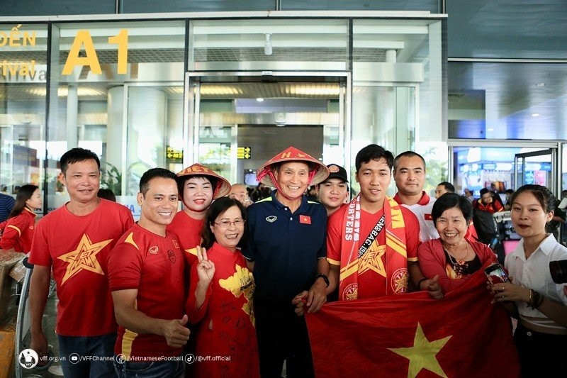 Đón đội ở sân bay quốc tế Nội Bài có đại diện của Cục Thể dục thể thao là bà Lê Thị Hoàng Yến – Phó Cục trưởng cùng Phó Tổng Thư ký Liên đoàn Bóng đá Việt Nam Nguyễn Thanh Hà cùng rất đông các cơ quan báo chí, truyền thông và người hâm mộ.