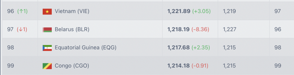 | Đội tuyển Việt Nam tạm thời thăng hạng 96 thế giới |