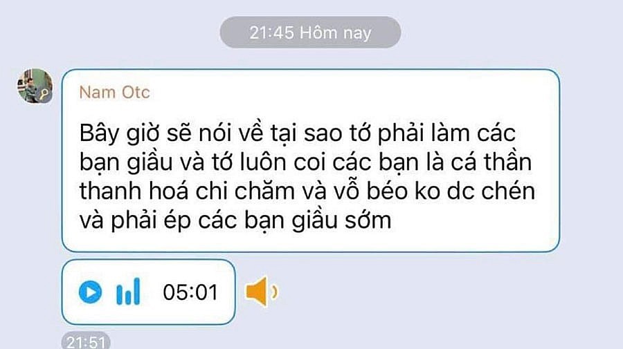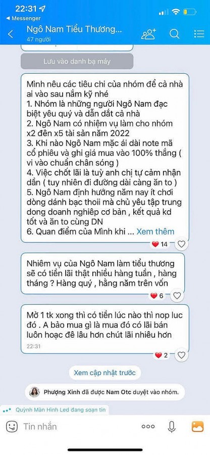 Anh P.N cho biết thêm: “Anh ta đã dùng uy tín Admin của group nội khu Royal, dùng tình cảm bạn bè đồng môn học đại học (cùng với tôi) để lôi kéo mọi người vào group zalo của anh ta. Kết quả, anh ta đưa ra lệnh mua trong group và tôi cùng mọi người mua giá đỉnh hết số tiền, thậm chí nhiều người vay mượn đi vay để vào thêm trung bình giá khi anh ta kêu gọi "mua đi đáy rồi" và lỗ thêm to. Chưa kể anh ta con nhắn tin riêng đưa lệnh mua, bán riêng nhằm bao bọc vào nói sẽ gỡ lỗ cho tài khoản của cá nhân tôi…”.