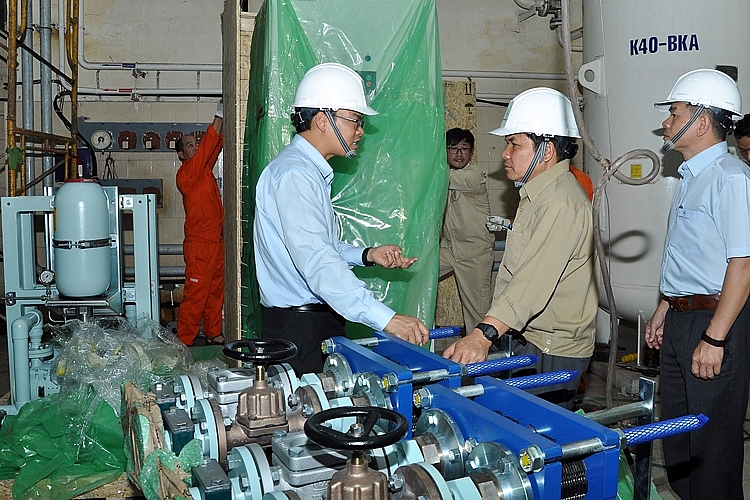 | Ông Đoàn Tiến Cường (bên trái) kiểm tra hệ thống khí nén tại Nhà máy Thủy điện Ialy |