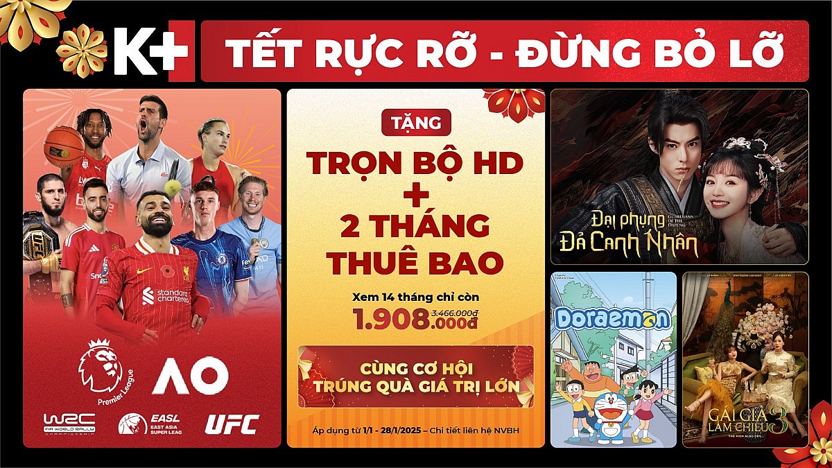 Với thông điệp: “Tết rực rỡ - Đừng bỏ lỡ”, K+ mang đến cho khách hàng khuyến mại hời đầu năm. Từ 1/1 - 28/1/2025, cho dịch vụ truyền hình vệ tinh, K+ tặng trọn bộ HD + 2 tháng thuê bao, xem 14 tháng nay chỉ còn 1.908.000 đồng (giá cũ 3.466.000 đồng).
