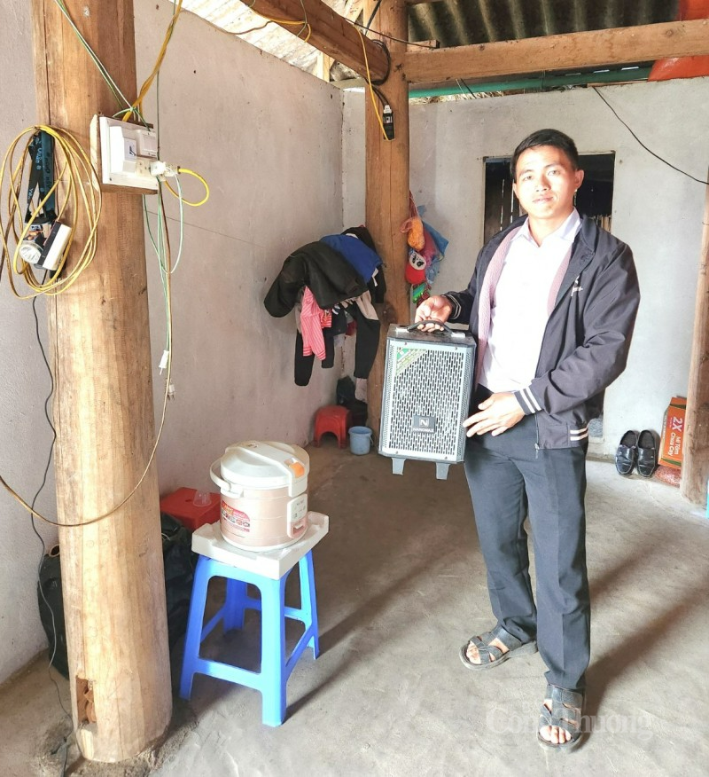 Vui hơn cả là Trưởng thôn Thào Seo Vần, nằng nặc đưa bằng được nhà báo về nhà mình để “khoe”những thiết bị điện mới mua sắm. Một tay cầm chiếc loa thùng, một tay nhấc nồi cơm điện anh Vần không giấu được nỗi vui mừng chia sẻ: Nhà báo thấy không cột điện về đến đầu nhà rồi, Tết năm nay gia đình tôi sẽ đón cái Tết vui nhất từ trước đến nay.