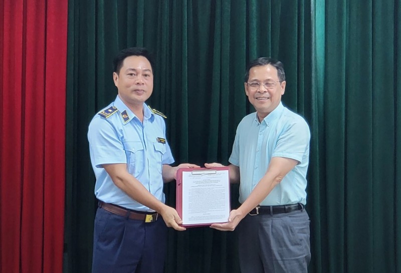 | Đồng chí Lê Thanh Hải, Chánh Văn phòng Thường trực Ban Chỉ đạo 389 quốc gia trao Quyết định tiếp nhận, bổ nhiệm cho đồng chí Đỗ Hồng Trung. (Ảnh Thu Hằng). |