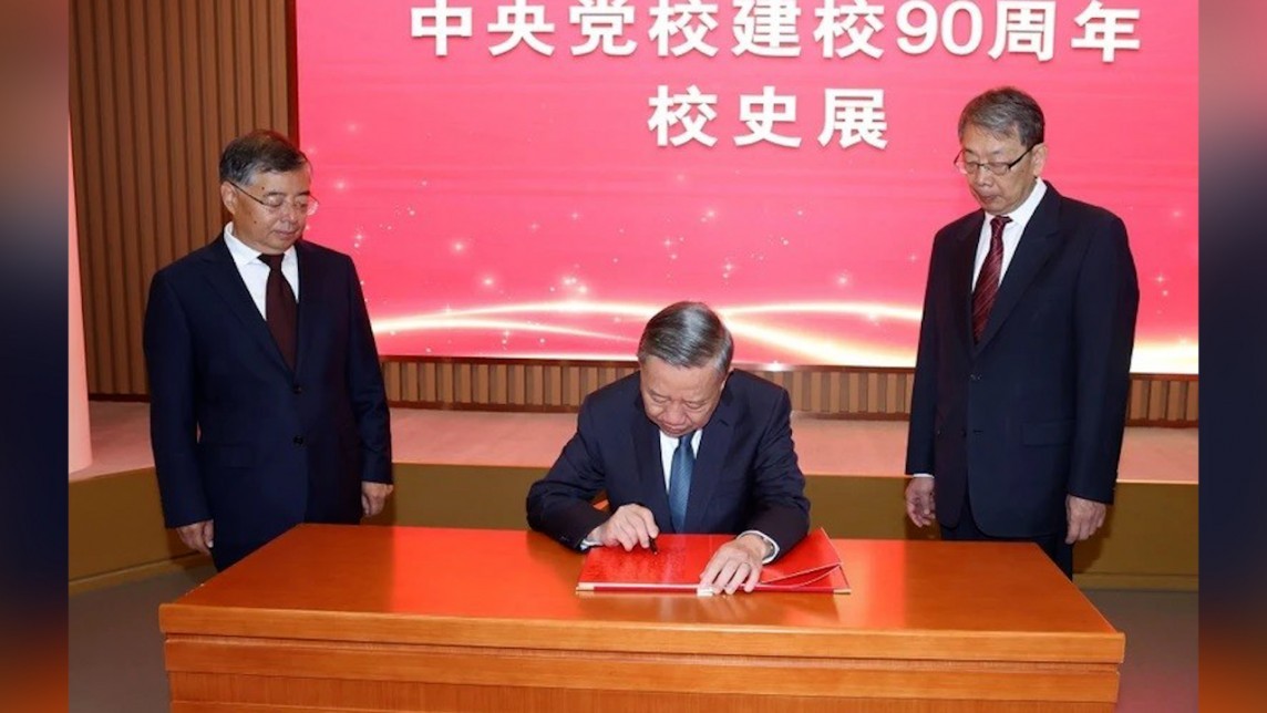 Tại đây, Tổng Bí thư, Chủ tịch nước Tô Lâm đã ghi lưu bút với nội dung: “Đoàn đại biểu cấp cao Đảng, Nhà nước Việt Nam rất vui mừng đến thăm Trường Đảng Trung ương Trung Quốc (Học viện Hành chính quốc gia) - cái nôi của nền giáo dục về lý tưởng cách mạng lý luận chính trị của Trung Quốc. Tôi tin tưởng và chúc mừng Trường Đảng Trung ương Trung Quốc với tinh thần không quên ước nguyện ban đầu, khắc ghi sứ mạng lịch sử sẽ luôn phát huy truyền thống vẻ vang hoàn thành xuất sắc các nhiệm vụ, sứ mệnh Trung ương Đảng Cộng sản Trung Quốc giao phó, xứng đáng là địa chỉ đỏ, cơ sở đào tạo quan trọng của Đảng, Nhà nước Trung Quốc.