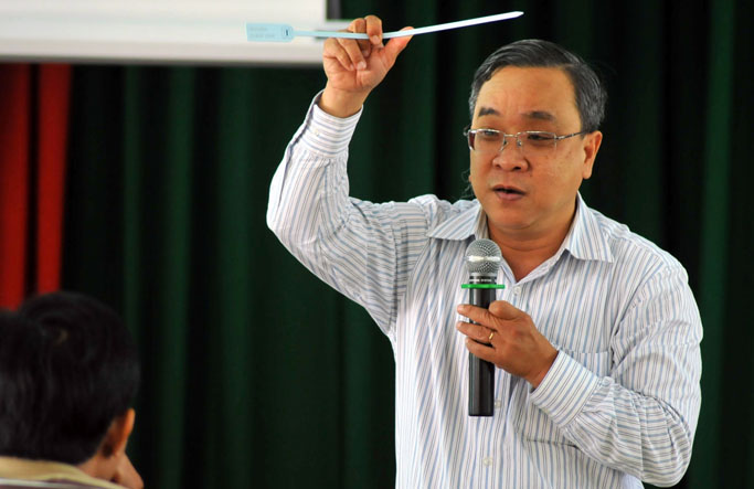 Ông Nguyễn Ngọc Hòa - Phó giám đốc Sở Công Thương TP. Hồ Chí Minh giới thiệu với người chăn nuôi heo ở Đồng Nai về vòng nhận diện để truy xuất nguồn gốc thịt heo