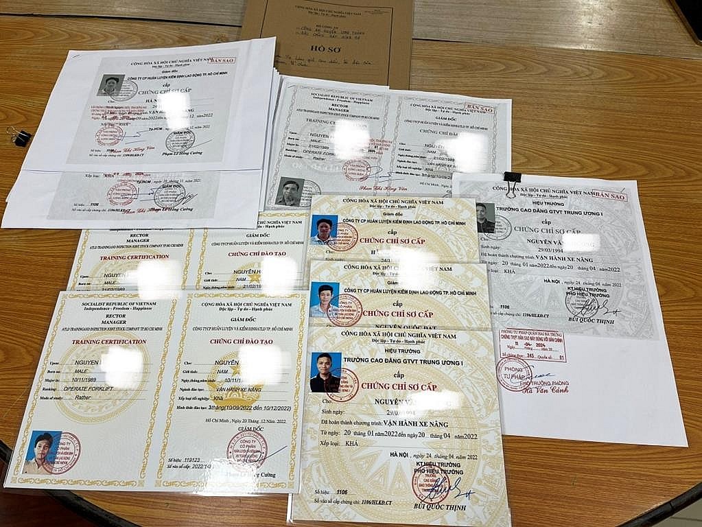 Tiếp đó, lực lượng chức năng khám xét tại nơi ở của các đối tượng, thu giữ 9 chứng chỉ sơ cấp của Trường Cao đẳng Giao thông vận tải Trung ương 1; 18 bản sao công chứng của Phòng công chứng quận Hai Bà Trưng, thành phố Hà Nội cùng nhiều tài liệu, vật chứng liên quan.