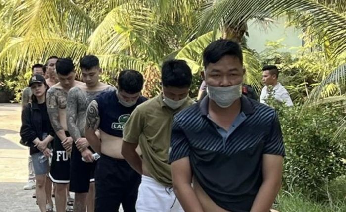 | Đối tượng Trịnh Thế Cảnh (đứng đầu) bị bắt khi tụ tập cùng nhóm đối tượng tại 1 khu resort thuộc ấp Rạch Hàm, xã Hàm Ninh, TP. Phú Quốc. |
