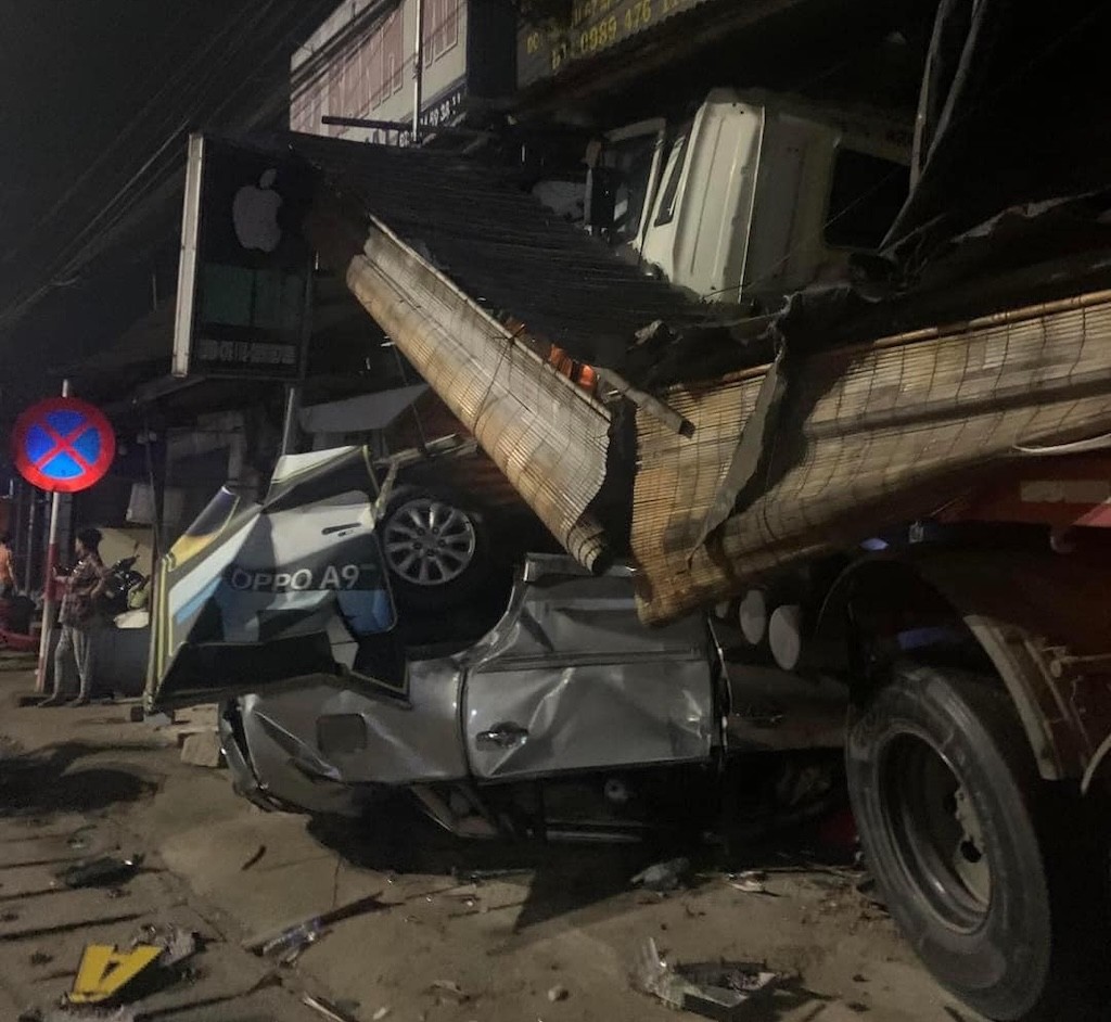 Ghi nhận ban đầu xe ô tô 7 chỗ nằm lật ngửa, biến dạng hoàn toàn khi xe con container đè lên, phần đầu của xe container cũng bị hư hỏng nặng. Còn một phần tường, cửa và mái hiện nhà dân bị đổ sập, hư hỏng nặng. Vụ tai nạn khiến ít nhất 2 người bị thương.