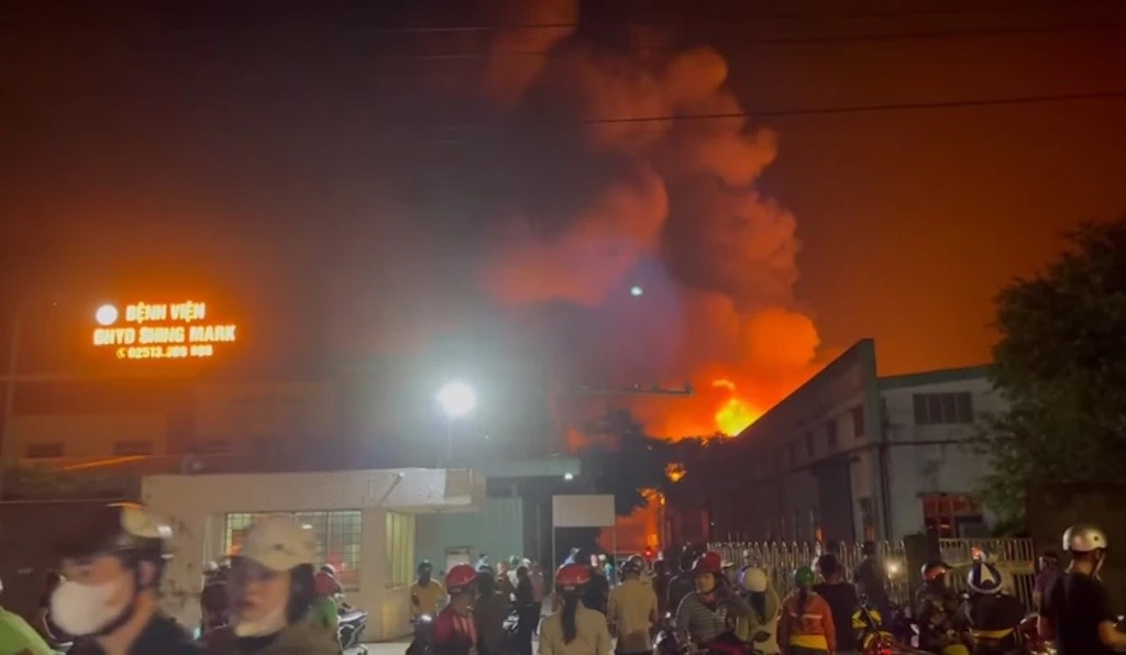 | Kho thành phẩm của Công ty TNHH Sing Mark Vina bất ngờ bùng cháy đêm khuya (Ảnh: Vũ Hội/PLO) |