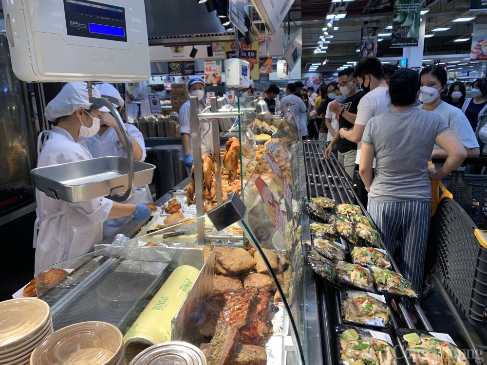 Tương tự tại siêu thị Co.opXtra Phạm Văn Đồng cũng đón lượng lớn khách hàng đến mua sắm trong 2 ngày 30/4 – 1/5. Theo ghi nhận tại siêu thị, các quầy hàng thực phẩm chế biến sẵn, hàng tươi sống, trái cây... là những khu vực hút nhiều khách nhất. Để đủ nguồn cung, nhân viên phải liên tục tăng cường hàng lên quầy kệ.