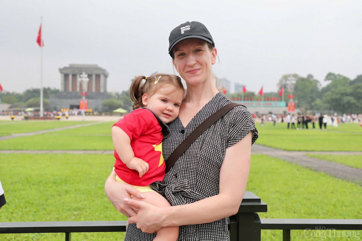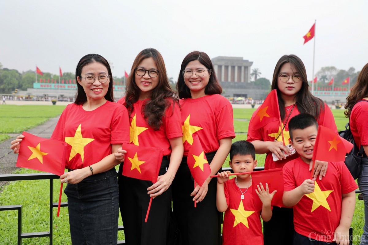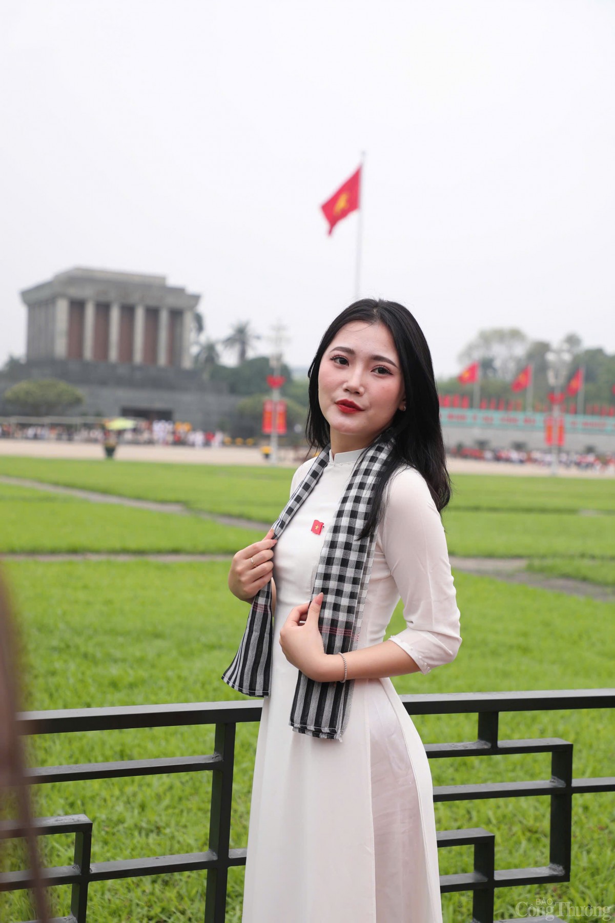 | Nhiều bạn trẻ diện áo dài, quàng khăn rằn tạo dáng chụp ảnh kỷ niệm trước Quảng trường Ba Đình, hòa cùng không khí trang nghiêm và tự hào của ngày lễ. |