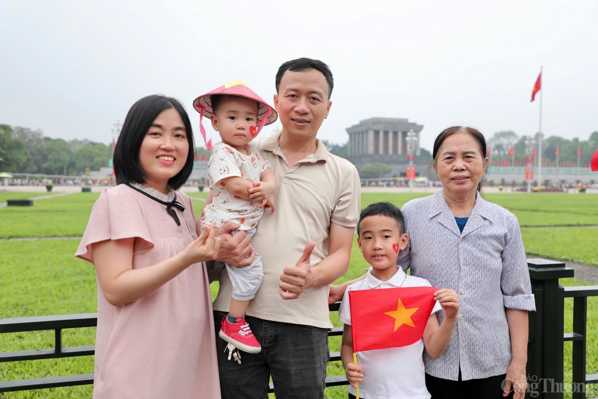 | Không thể vào TP. Hồ Chí Minh dự các hoạt động kỷ niệm dịp 30/4, chị Nguyễn Thanh Huyền (ngoài cùng bên trái) 41 tuổi, quận Hà Đông cùng đại gia đình đã chọn đến viếng Lăng Bác. “Cả nhà đều mặc áo in cờ đỏ sao vàng, cầm theo cờ Tổ quốc, chụp ảnh trước Lăng để lưu lại khoảnh khắc đáng nhớ này. Dù không được vào miền Nam, nhưng được đứng đây vào sáng 30/4 lịch sử cũng là một niềm hạnh phúc rất lớn”, chị Huyền chia sẻ |