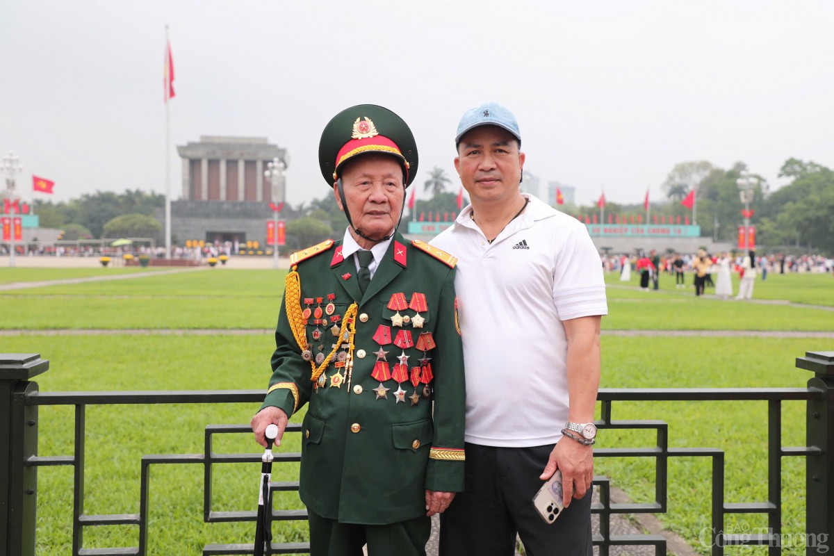 | Cựu chiến binh trong bộ quân phục gắn đầy huân chương chụp ảnh lưu niệm cùng người thân trước Lăng Chủ tịch Hồ Chí Minh sáng 30/4 - dấu ấn của một thế hệ từng đi qua chiến tranh, nay trở về giữa ngày hội thống nhất, hòa bình. |