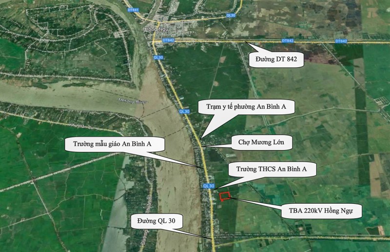 | Xét đề nghị của Ban quản lý dự án các công trình điện miền Nam và Sở Công Thương Đồng Tháp, UBND tỉnh Đồng Tháp thống nhất vị trí đặt trạm biến áp 220kV Hồng Ngự tại khóm An Lợi, phường An Bình A, TP. Hồng Ngự, Đồng Tháp. Ảnh: Vị trí trạm biến áp 220kV Hồng Ngự trên ảnh vệ tinh |
