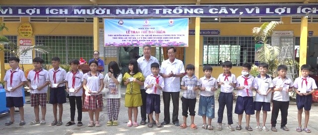 Nhà tài trợ trao tặng thẻ bảo hiểm y tế cho học sinh có hoàn cảnh khó khăn trên địa bàn huyện Tam Nông (Ảnh: Báo Đồng Tháp) |