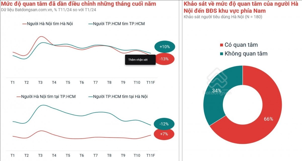 Ông Đinh Minh Tuấn cho rằng, dòng tiền đang có dấu hiệu tìm kiếm cơ hội “chảy” vào Nam sau thời gian tập trung chủ yếu tại Hà Nội. Theo dữ liệu của đơn vị này, lượng người Hà Nội tìm kiếm bất động sản tại TP. Hồ Chí Minh vào tháng 11/2024 đã tăng 7% so với tháng 1/2024. Ngược lại, lượng người TP. Hồ Chí Minh tìm kiếm bất động sản Hà Nội giảm 12% trong cùng giai đoạn. Khảo sát của Batdongsan.com.vn cũng cho thấy 66% người Hà Nội được hỏi quan tâm đến bất động sản phía Nam.