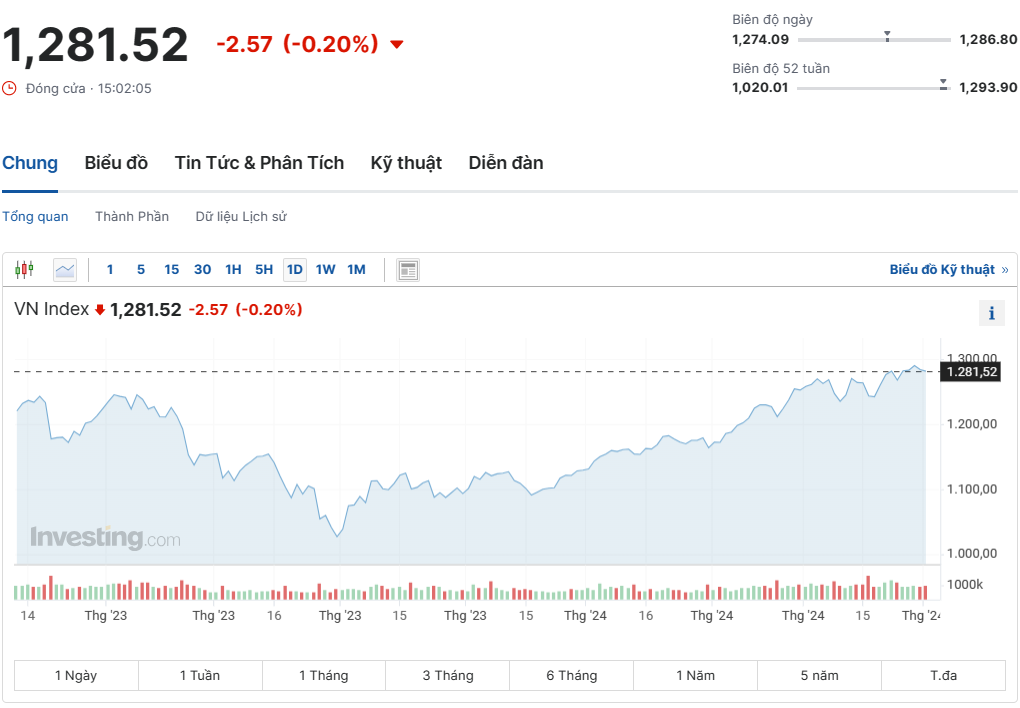 Sự suy yếu của dòng tiền là nguyên nhân khiến VN-Index mất động lực tăng điểm. Kết phiên chỉ số này giảm 2,57 điểm (tương đương 0,2%) xuống còn 1.281,5 điểm.