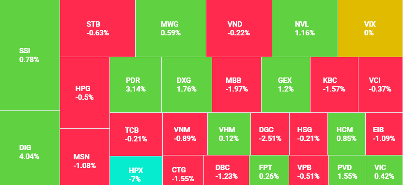 Trong phiên giao dịch hôm nay, nhóm bất động sản đi ngược xu hướng chung khi đa số cổ phiếu ghi nhận sắc xanh. Nổi bật trong đó là NVL tăng 1,16%, PDR tăng 3,14%, DIG tăng 4,04%, NLG tăng 1,04%, DXG tăng 1,76%, TCH tăng 1,59%, QCG tăng 3,17%, DXS và SGR tăng kịch trần. Sắc đỏ hiện lên ở thiểu số cổ phiếu, trong đó có BCM, VRE, KBC, VPI...