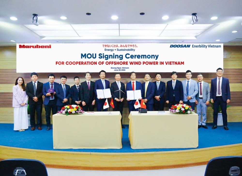 Theo đó, Công ty Doosan Vina đã ký Biên bản ghi nhớ (MOU) “Hợp tác phát triển điện gió ngoài khơi tại Việt Nam” với Tập đoàn Marubeni, Nhật Bản nhằm thúc đẩy hoạt động kinh doanh mới của hai đơn vị trong lĩnh vực năng lượng xanh và bền vững.